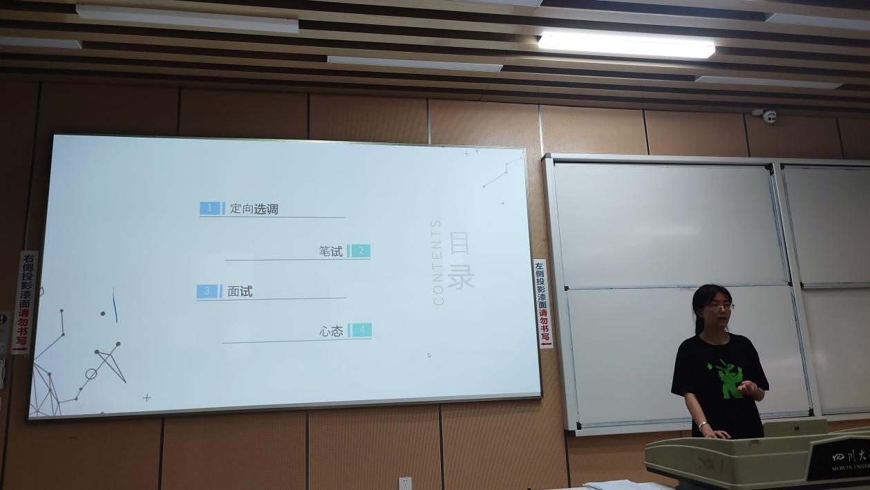 首先,2018级熊迎康、赵一蒋同学为大家分享了各自在去年秋招中的心得体会,他们从简历的制作、投递以及面试技巧等方面提供了较为详细的分享,鼓励同学们广泛投送简历以保证自主的选择权,并在面试中保持低调但自信的面貌,给面试官留下好印象。
