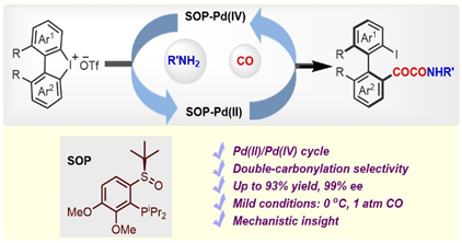 廖建教授团队发展了一种以手性亚砜膦/钯络合物为催化剂,通过高价钯催化途径的不对称胺羰化新策略。相关研究成果“Enantioselective double carbonylation enabled by high-valent palladium catalysis”发表在《Journal of the American Chemical Society》上,化工DB真人