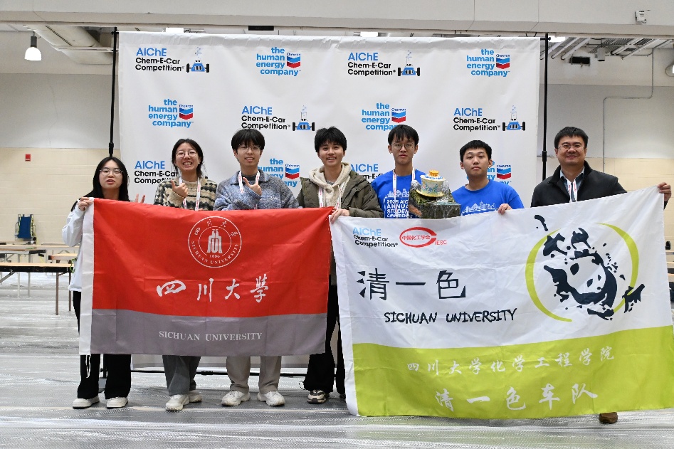 由康毅进老师带队,黄小峰、刘庭锐、赵国江、刘霞、周俊竹、赵思佳六名同学组成的“四川大学清一色车队”代表中国参赛。在王缘、吴振国两位老师的指导下,队伍为本次全球赛设计了全新的锌-空气电池动力系统。比赛过程中,团队面临控制试剂不足的突发状况,在康毅进老师的协助下积极筹措资源,并果断调整控制方案,最终凭借稳定的现场发挥,以0.617米的精准制动距离,在53支参赛队伍中斩获全球第十名的优异成绩。