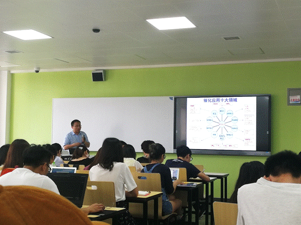 杨铎老师从地理位置、师资力量、研究成果、研究生的招收情况、奖(助)学金体系和未来的就业方向等方面全面介绍了大连化物所的基本情况及研究生教育基本情况。四川大学2007届校友,国家重点研发计划青年首席、张大煜青年学者邓德会研究员为同学们作了《穿着铠甲的催化剂》的学术报告,为同学们详细介绍了有关催化剂的专业学术性知识,例如催化剂的作用、发展、分类、新物质等。在研究员老师风趣幽默、同学认真专注的学习氛围中讲座圆满结束。报告结束后,熊博晖主任、邓德会研究员和杨铎工程师共同回答了学生的提问。