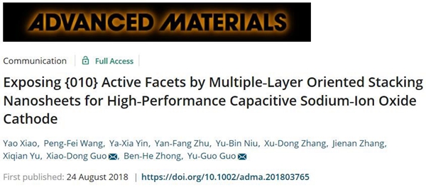 新能源材料与器件课题组郭孝东副教授团队在钠离子电池研究方面取得突破性进展。相关研究成果“Exposing {010} Active Facets by Multiple-Layer Oriented Stacking Nanosheets for High-Performance Capacitive Sodium-Ion Oxide”发表于国际顶级期刊Advanced Materials(影响因子21.950)上。该论文第一作者为DB真人-DB真人试玩