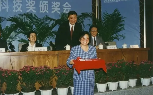 1996年钟本和获首届亿利达科技奖,丁肇中为她颁奖
