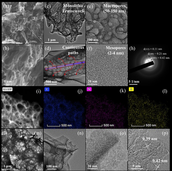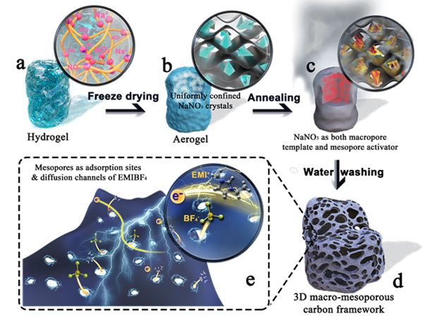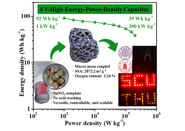 基于这一关键问题,课题组研究人员采用绿色低成本的盐模板法,从生物质明胶中制备出了一种独特的大孔-介孔耦合碳电极材料,并以EMIBF4离子液体为电解质,在4V的工作电压下,取得出色的能量-功率性能,在1 kW kg-1的功率密度下,获得92 Wh kg-1的能量密度,在200 kW kg-1下,仍能保留39 Wh kg-1,达到目前同类多孔碳材料性能最高值。该电极材料的特点在于: 介孔尺寸在2-4 nm,是EMI+和BF4-尺寸的3~5倍,同时大量的介孔都镶嵌耦合在50-150 nm的大孔骨架中,此类大孔-介孔耦合的结构为EMI+和BF4-提供了流畅的传输路径,极大地改善了电解质在孔内的质量传递,使得功率密度得到有效的保证。同时,由于该材料具有~2800 m2 g-1的超高比表面积,保证材料具有充足的吸脱附活性位点,利于电荷大量存储。