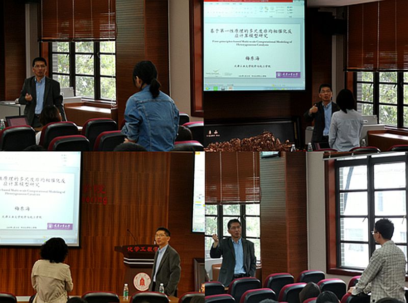 梅东海教授向大家展示了如何从第一性原理出发,结合蒙特卡洛动力学模型和计算流体力学开展多尺度的非均相催化反应过程模拟,以及通过计算模拟进一步指导非均相催化剂开发。梅教授以PtOx/γ-Al2O3,Pt/CeO2等多个典型催化剂和反应体系的研究工作为范例,介绍了通过DFT计算在分子水平上重新认识固体表面催化反应活性中心结构和表面反应历程,从而指导和帮助实验科学家进行更高效的催化剂设计。在介观尺度上,利用蒙特卡洛方法在更接近真实的表面反应条件下,通过理论计算来模拟和预测催化反应动力学。在宏观尺度上,利用蒙特卡洛方法获得的动力学信息结合连续流体理论模型,通过CFD模拟来考察热量和质量传递过程对催化反应过程的影响。梅教授一个个生动的案例向大家展示了理论计算的魅力,令在座的老师和同学都受益匪浅。