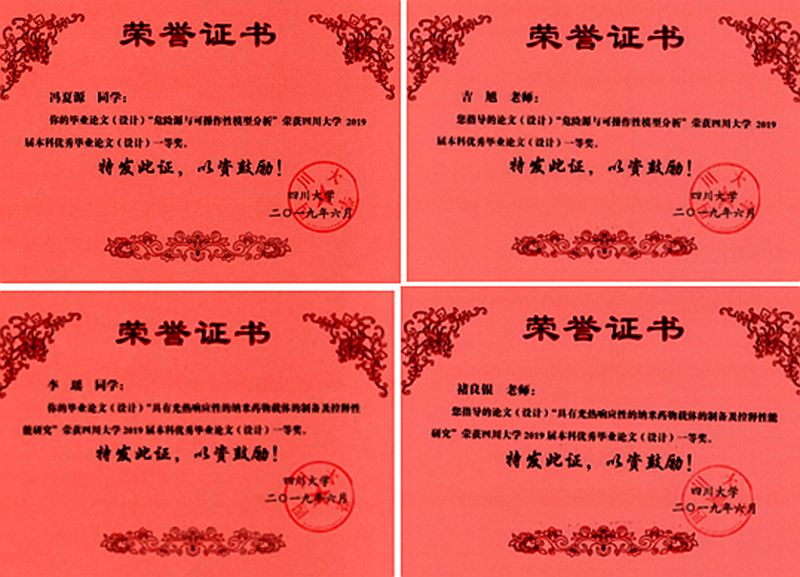 川大教【2019】102号文件公布了“四川大学关于表彰2019届本科优秀毕业论文(设计)获奖者的决定”,并对获奖学生和指导老师给予了表彰,其中DB真人
