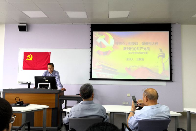 随后,汪朝清老师为2019届毕业生党员上了“毕业前的一堂特殊党课”。对各位毕业生党员获得优异成绩表示祝贺,对各位毕业生踏上新的人生征途,追求各自的人生理想表示衷心的祝福。他在授课中讲到,第一,党员同志要勇担大任的新时代共产党员,要不忘初心,牢记使命。毕业生党员正处于人生的黄金时期,将直接参与实现两个一百年奋斗目标,青年党员要积极投身全面建设现代化强国的伟业,使命光荣,要接好历史的接力棒;第二,“初心”和“使命”的内涵以及其在毕业生党员中的具体表现。要保持终身学习的热情和动力,求真学问、练真本领,广泛阅读尤其是阅读马克思主义著作,并向社会这本无字之书学习,不断提升专业能力和专业精神;要勇于担当,敢于突破,不断追求卓越,为建设科技强国贡献智慧和力量。第三,毕业生党员怎样才能成为勇担复兴大任的时代新人。汪老师鼓励我们在未来的学习、工作、生活中继续勤奋刻苦、脚踏实地,在各方面起到带头作用、骨干作用和纽带作用,继续发挥好党员的先锋模范作用,开拓创新,勇往直前,服务祖国,奉献祖国。授课中,汪老师和同学们热情互动,同学们热情高昂,纷纷提问,汪老师以丰富的人生经验,耐心地为同学们做出了解答。