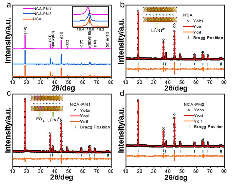 Fig. 1 (a) XRD图:NCA,NCA-PM1,NCA-PM;插图代表相应的(003)峰。(b-d) XRD精修图:NCA,NCA-PM1,NCA-PM