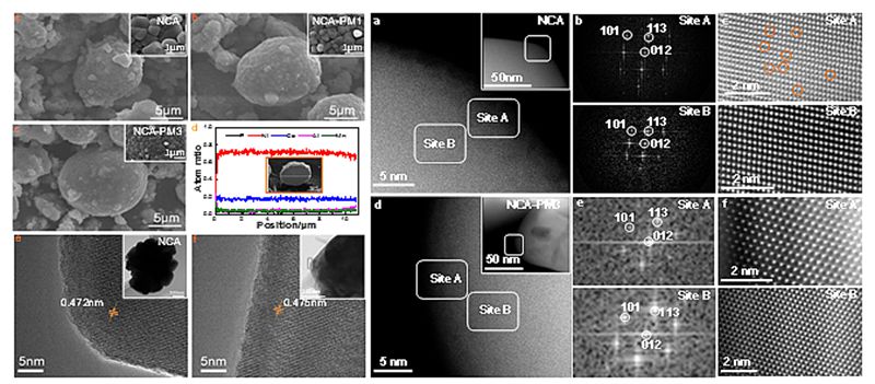 Fig. 2 (a-c) SEM图:NCA,NCA-PM1,NCA-PM3。(d) NCA-PM3横截面元素分布图。(e,f) HR-TEM图:NCA,NCA-PM3,插图为更低倍HR-TEM图。