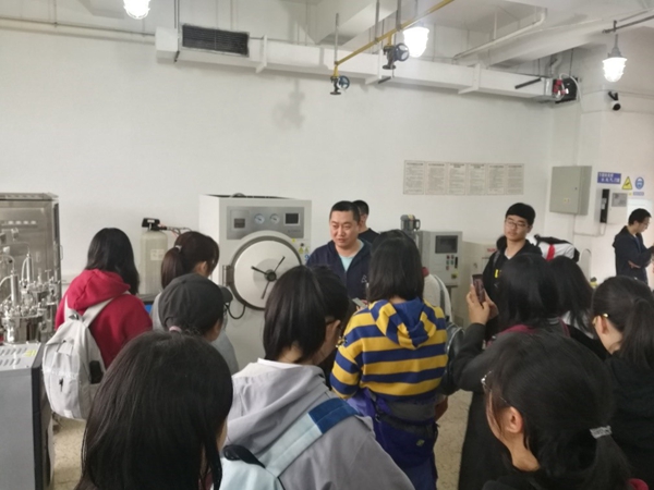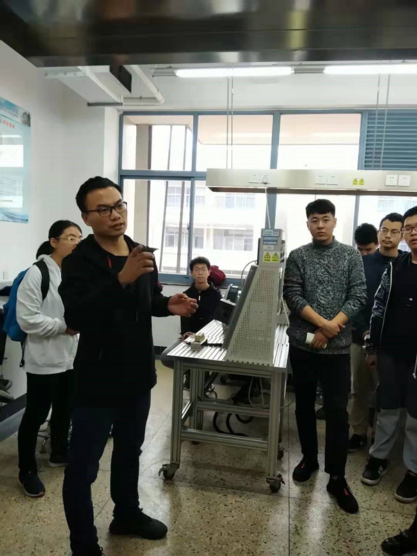 公用仪器开放平台的红外光谱、气相色谱、热重、ICP等公用设备。林老师以提问的方式引导学生对每一台设备的原理及用途进行思考,激发同学们的科研兴趣。最后同学们依据自己所属专业分别参观了各专业实验室,参观过程中王袁隆老师和魏竭老师分别负责了过控实验室和生工制药实验室的参观,详细的讲解专业实验开设课程及实验设备,为同学们展示的相关专业的学科特色。