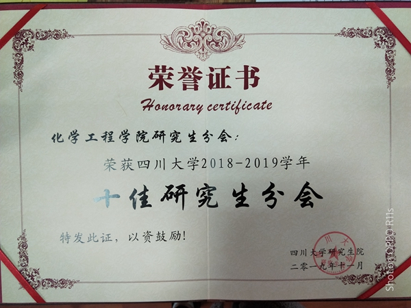 研究生会以全校第七的成绩荣获“四川大学2018-2019学年十佳研究生会”荣誉称号。