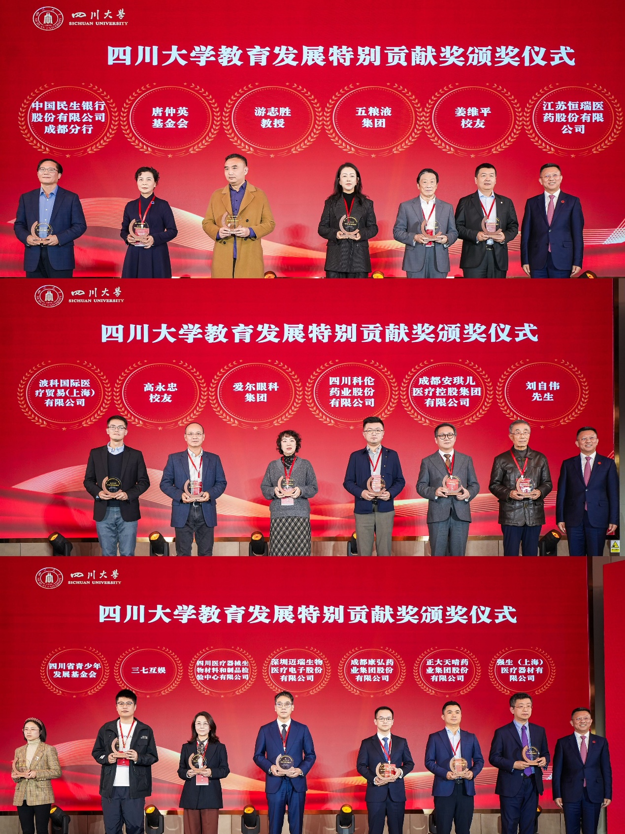 表彰环节中,刘晓虎为“四川大学教育发展贡献奖”获奖单位及个人颁奖,感谢捐赠方长期为学校教育事业发展提供的坚实保障。